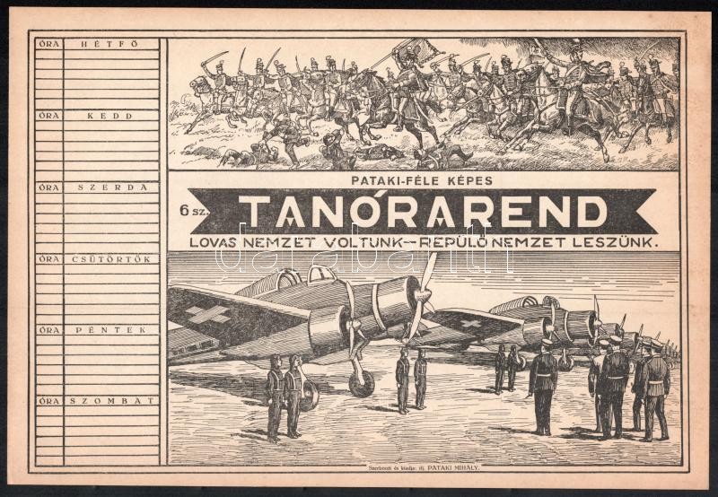 cca 1930 Pataki-féle képes tanrend, Lovas nemzet voltunk, repülő nemzet leszünk, kitöltetlen, szép állapotban