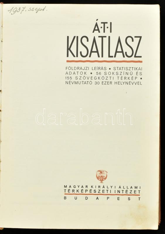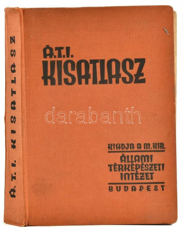 cca 1934 ÁTI kisatlasz. Földrajzi leírás, statisztikai adatok, 56 sokszínű és 155 szövegközti térkép, névmutató 30 ezer helynévvel. Bp., é.n., Magyar Királyi Állami Térképészet, VIII+176 p.+32 t.(térképek)+156+4 p. (névmutató.) Kiadói egészvászon-kötés, k