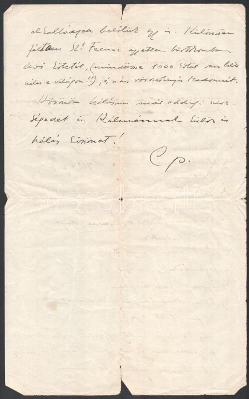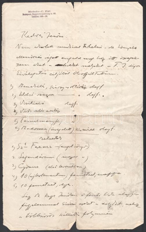 cca 1935 Molnár C. Pál (1894-1981) festőművész, grafikus által kézzel írt levél ismeretlennek, Jenő megszólítással, amelyben egy díjra beadott festményekről, általa illusztrált könyvekről és metszetekről állít össze listát. Másfél beírt oldal, Molnár C. P