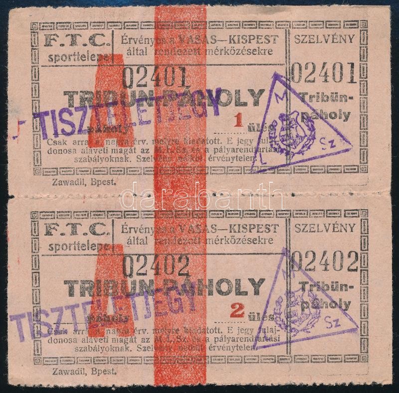 cca 1940-1950 FTC sporttelep tribünpáholy tiszteletjegy Vasas-Kispest mérkőzésekre, 2 db sorszámkövető jegy<a href="https://www.darabanth.com/hu/gyorsarveres/417/kategoriak~Mutargy-papirregiseg-egyeb/Okmanyok~19/cca-1940-1950-FTC-sporttelep-tribunpa