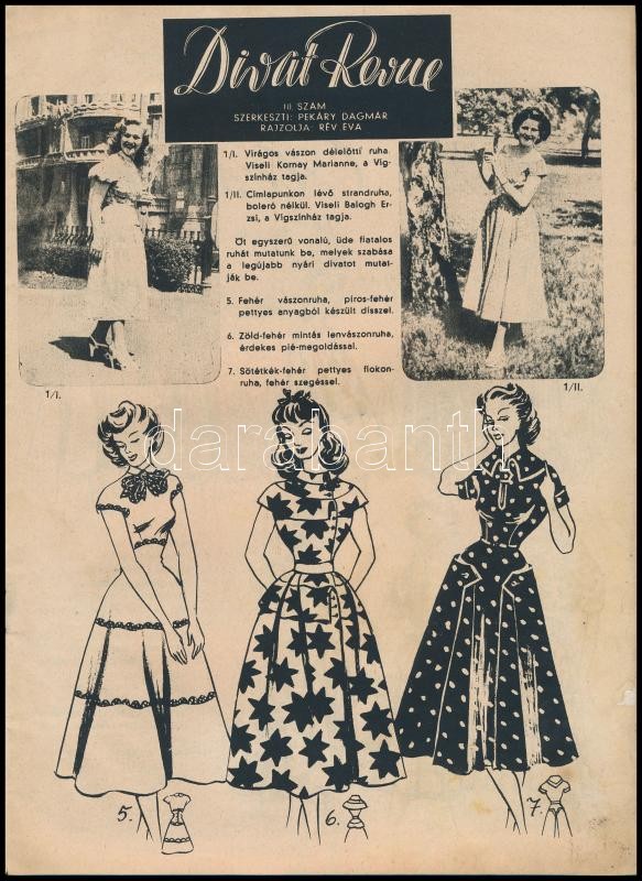 cca 1940 Divat Revue újság egy száma. Szerk.: Pekáry Dagmár. Rajzolta: Rév Éva. Bp., Légrády, 8 sztl. lev. Foltos borítóval, és borítón címkenyommal, az utolsó lapon szakadással.