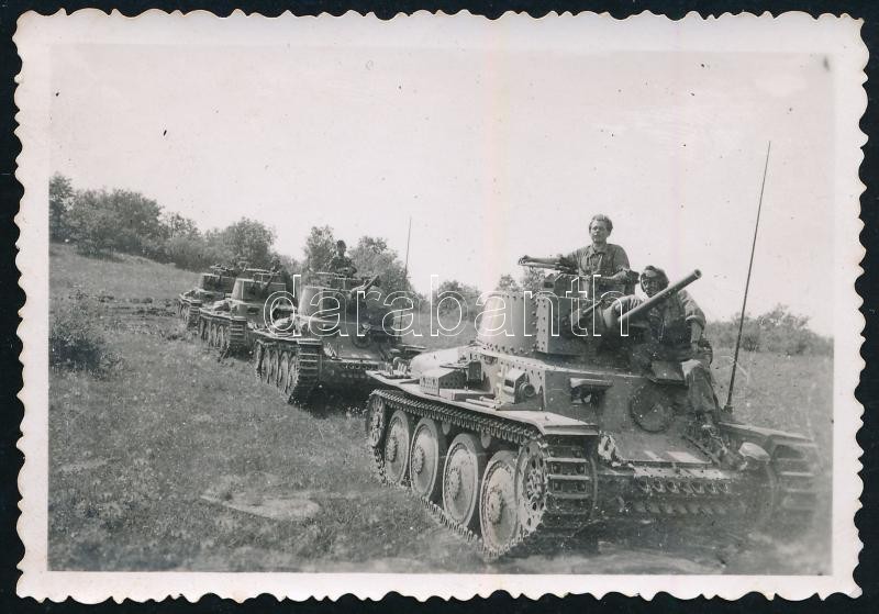 cca 1940 II. világháborús német Pz.Kpfw. 38(t) harckocsik menetben, fotó, 8,5×6 cm / WWII German Pz.Kpfw. 38(t) tanks, photo, 8.5×6 cm<a href="https://www.darabanth.com/hu/gyorsarveres/421/kategoriak~Mutargy-papirregiseg-egyeb/Militaria~500028/cca-1