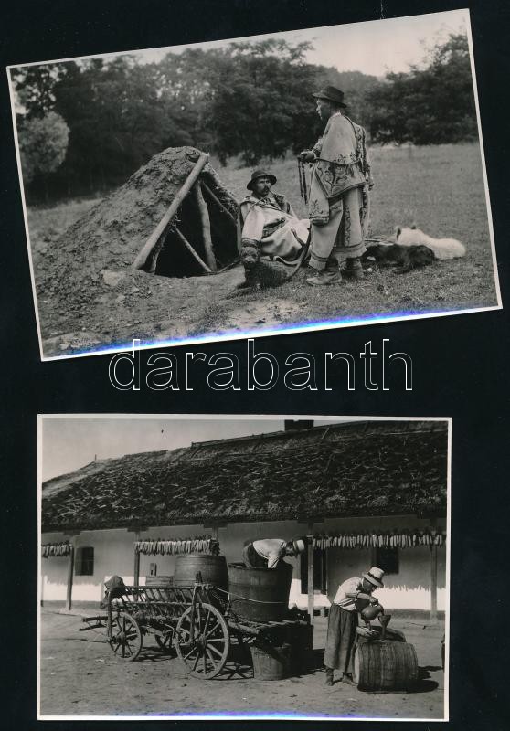 cca 1940 Vegyes néprajzi fotó tétel, 2 db, pipázó pásztorok kutyákkal, hordókkal foglalatoskodó férfiak, hullámosak, 8×12 cm és 8×11 cm<a href="https://www.darabanth.com/hu/gyorsarveres/419/kategoriak~Fotomuveszet/Foto~500023/cca-1940-Vegyes-neprajz
