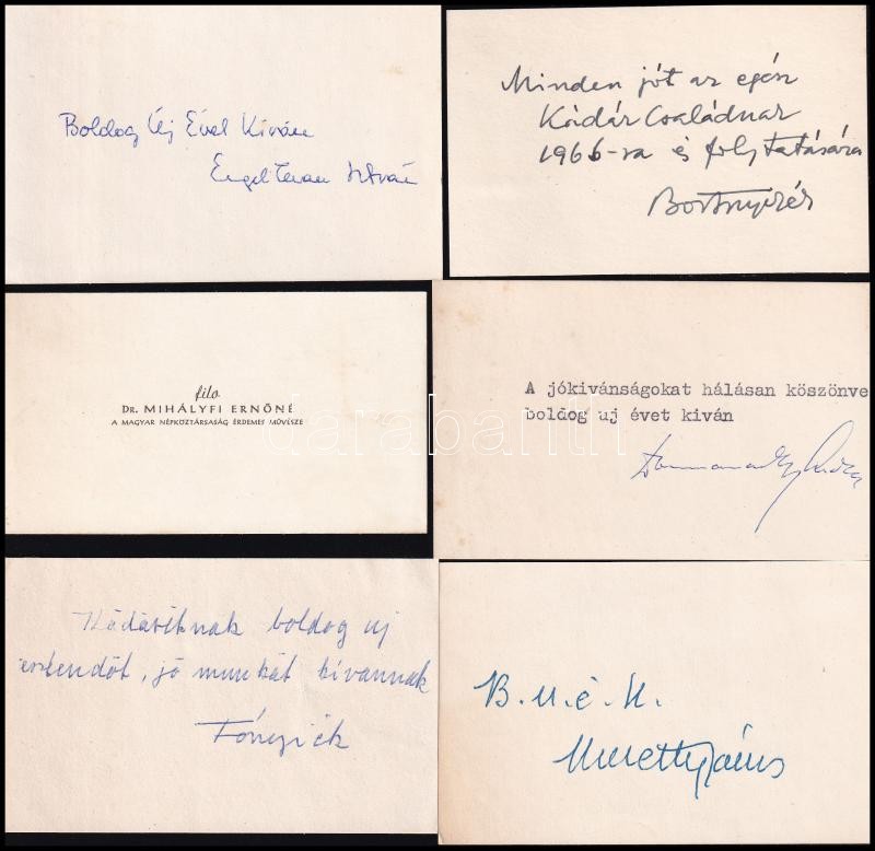 cca 1966 Neves művészek újévi üdvözlőkártyái (Kmetty, Bortnyik, Mihályfi Ernőné, stb.), 6 db<a href="https://www.darabanth.com/hu/gyorsarveres/412/kategoriak~Mutargy-papirregiseg-egyeb/Tortenelmi-dokumentumok-keziratok-erdekessegek~500019/cca-1966-N