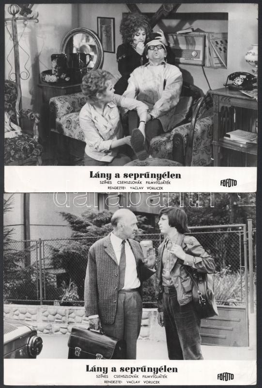 cca 1971 ,,Lány a seprűnyélen’ című csehszlovák filmvígjáték jelenetei és szereplői, 13 db vintage produkciós filmfotó, ezüst zselatinos fotópapíron, a használatból eredő (esetleges) kisebb hibákkal, 18×24 cm<a href="https://www.darabanth.com/hu/gyo