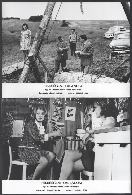 cca 1974 ,,Feleségem kalandjai – egy női Sherlock Holmes három telitalálata’ című csehszlovák film jelenetei és szereplői, 13 db vintage produkciós filmfotó, ezüst zselatinos fotópapíron, a használatból eredő kisebb hibákkal, 18×24 cm<a href="https: