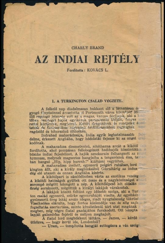 Charly Brand: Az indiai rejtély. Detektív és kalandor regények. Bp., é.n. (1933 körül), Müller D. Kiadói papírkötés, sérült, megviselt állapotban