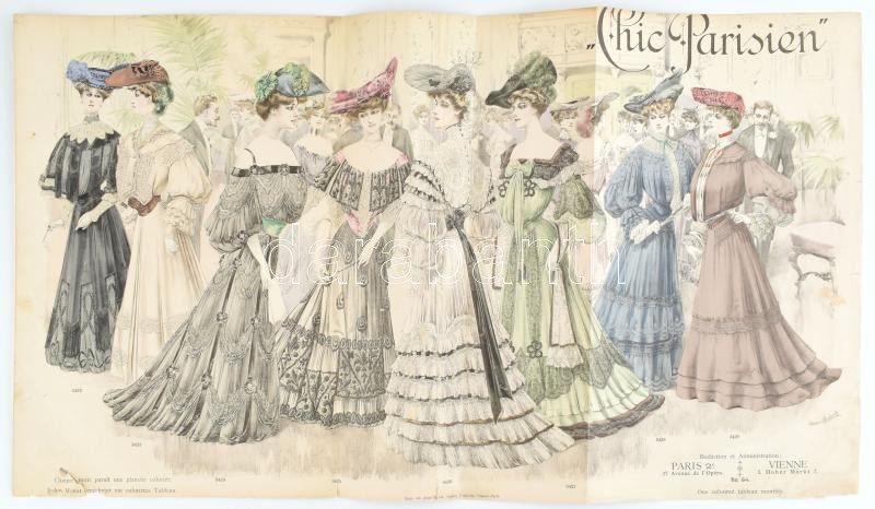 Chic Parisien No. 64 (női divatkép), 1900 körül. Színes litográfia, papír, jelzés nélkül. Sérült, kissé foltos. 38×65 cm.<a href="https://www.darabanth.com/hu/gyorsarveres/439/kategoriak~Festmenyek-es-grafikak/Metszetek~1000004/Chic-Parisien-No-64-n