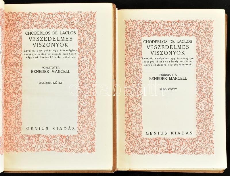 ![Choderlos de Laclos, [Pierre Ambroise François (1741-1803)]: Veszedelmes viszonyok I-II. kötet. Levelek, amelyeket egy társaságban összegyüjtöttek és némely más társaságok okulására közrebocsátottak. Ford.: Benedek Marcell. Nagy - Image 3](https://mutargy.com/wp-content/uploads/2024/12/2561938b.jpg)