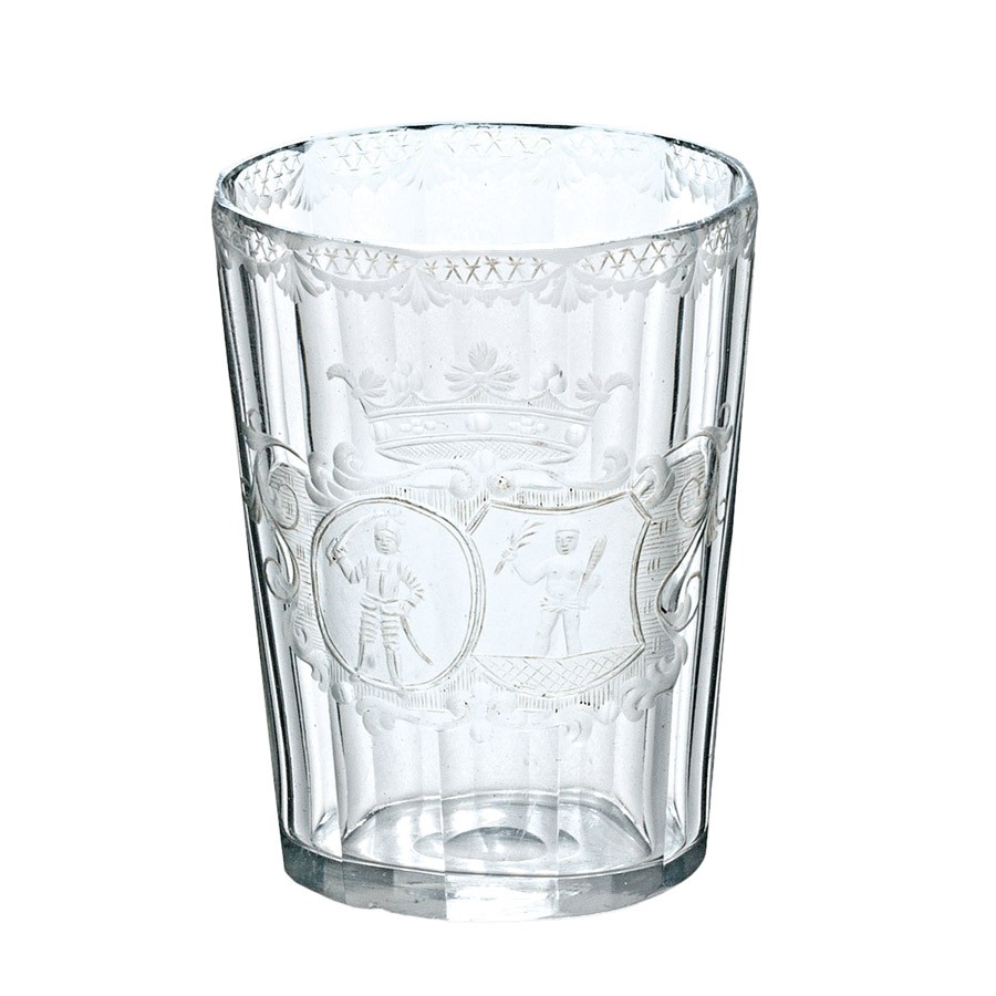 német (?), 19. sz., színtelen, fazettált üveg, köszörült páros címer koronával, páncélos vitéz és kalászszedő alakjával, talpán apró csorbulással, m: 8, 5 cm