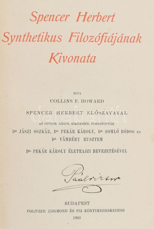 Collins F. Howard: Spencer Herbert Synthetikus Filozófiájának Kivonata. Pekár Károly dr. életrajzi bevezetésével. Budapest, 1903, Poltzer zsigmond Könyvkereskedése.Kopottas, kiadói, egészvászon kötésben.