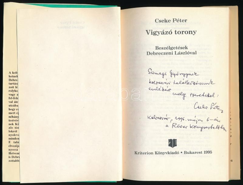 Cseke Péter: Vigyázó torony. Beszélgetések Debreczeni Lászlóval. A szerző, Cseke Péter (1945-) irodalomtörténész által Sümegi György (1947-) művészettörténésznek dedikált példány! Bukarest, 1995, Kriterion. Fekete-fehér képekkel illusztrált. Kiadói karton