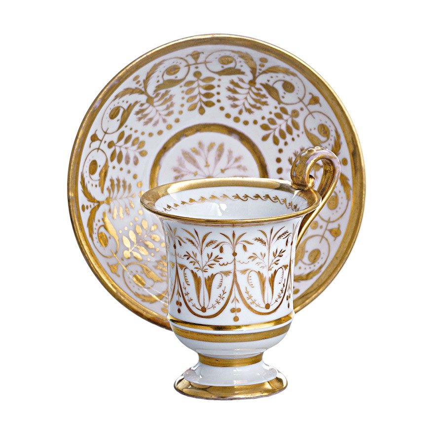 német, 19. sz. első fele, aranyozott porcelán, talpán máz alatti kék jelzet és a tányéron FB jelzés, m: 10 cm; d: 14 cm