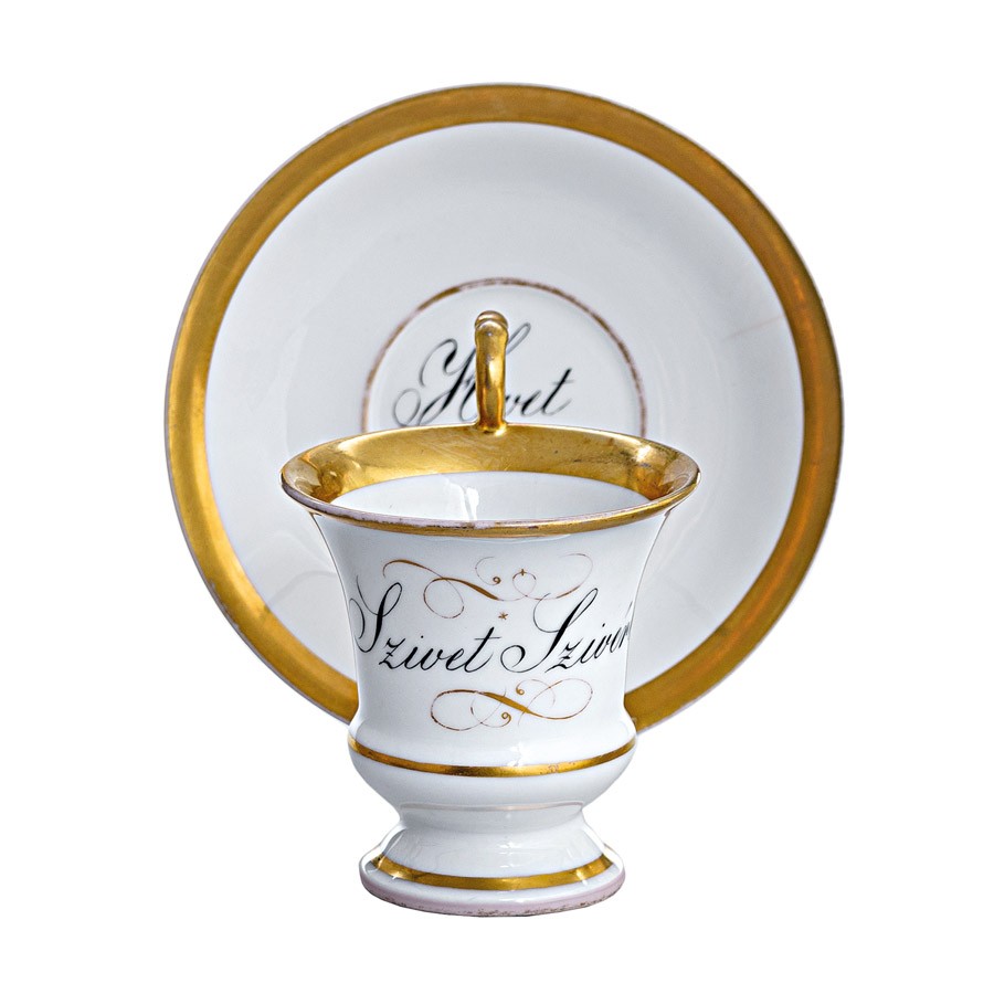 magyar, 19. sz. második fele, aranyozott porcelán, "Szívet szívért és hívet hívért" feliratokkal, hajszálrepedésekkel, m: 10 cm; d: 14 cm