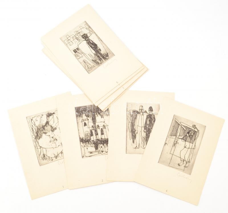 Csohány Kálmán (1925-1980): 12 db karc. Rézkarc, papír, mind jelzett. számozott példány (56/100). Kiadói kartonmappában, mappa gerincén kisebb szakadással, máskülönben jó állapotban. Hiánytalan, mind a 12 db rézkarc külön lapon! 12×8 cm<a href="http