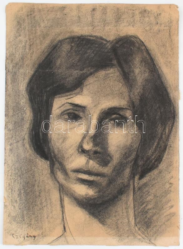 Czigány jelzéssel: Női portré. Szén, papír, kissé sérült (törésnyomokkal). 43×30,5 cm<a href="https://www.darabanth.com/hu/gyorsarveres/414/kategoriak~Festmenyek-es-grafikak/Festmenyek-es-grafikak-jelzessel-jelzes-nelkul~500002/Czigany-jelzessel-Noi
