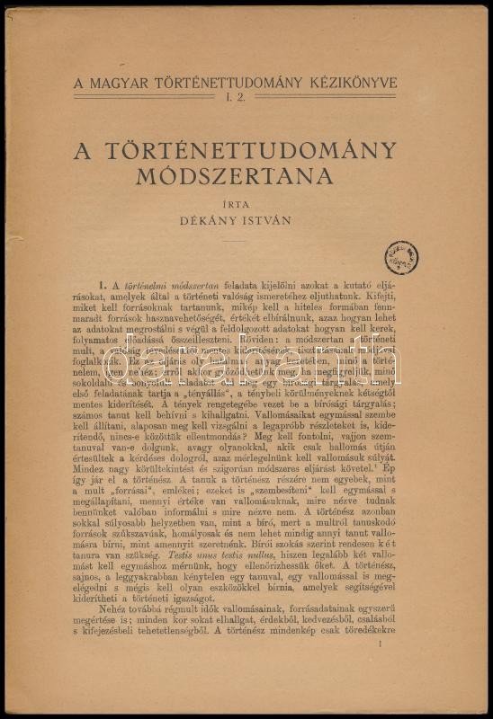 Dékány István: A történettudomány módszertana. Magyar Történettudomány Kézikönyve I. köt. 2. füzet. Bp., 1925., Magyar Történelmi Társulat, 74 p. Kiadói papírkötés, kissé szakadt borítóval, felvágatlan lapokkal. ‘Fügedi Erik Könyve’ bélyegzéssel, Fügedi E