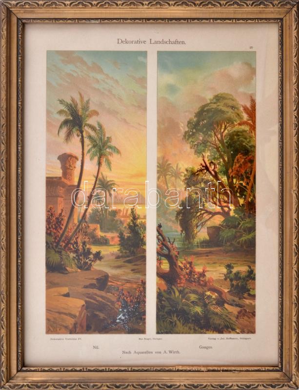 Dekoratív, régebbi üvegezett, kissé sérült fakeret. Tájkép nyomattal: Nílus, Gangesz (Dekoratíve Landschaften a Dekorative Vorbilder sorozatból, 1900 körül). Belső méret kb. 32×24 cm<a href="https://www.darabanth.com/hu/gyorsarveres/424/kategoriak~M