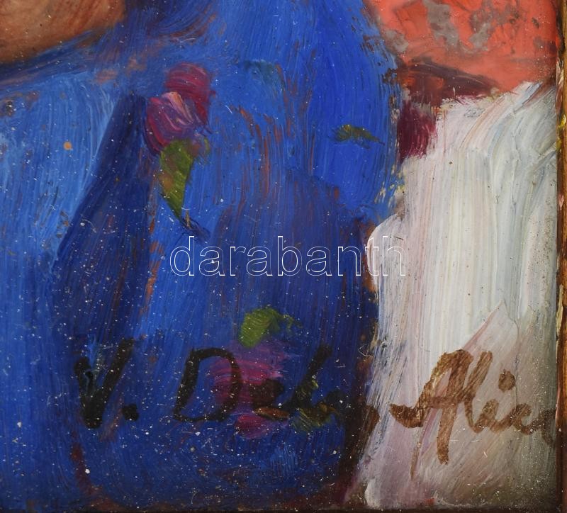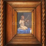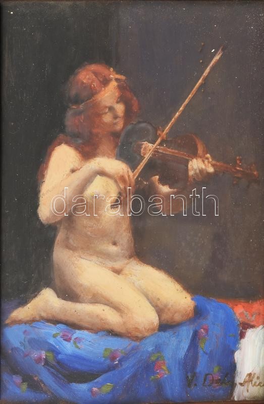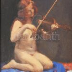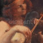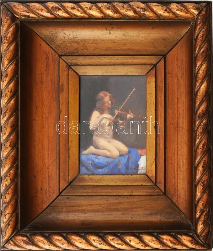 Dely Alice (Béli Vörös Ernőné) (1887 – ?) Akt hegedűvel. Olaj, Karton. Jelzett, üvegezett dekoratív fa keretben 16×11 cm / olil on board, signed, framed