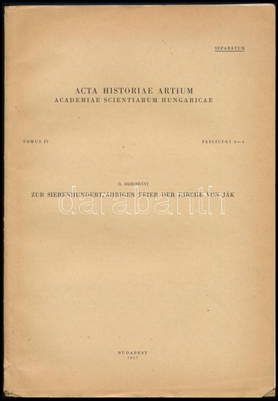 Dercsényi,D(ezső): Zur siebenhundertjährigen Feier der Kirche von Ják. Acta Historiae Artium különlenyomat. Bp., 1957., MTA, 173-202 p. Fekete-fehér egészoldalas és szövegközti fotókkal és illusztrációkkal illusztrált. Német nyelven. Papírkötés.<a h