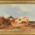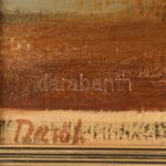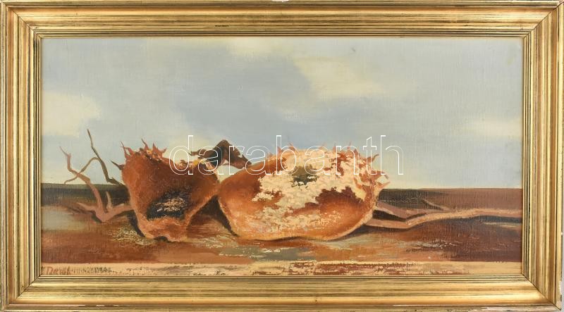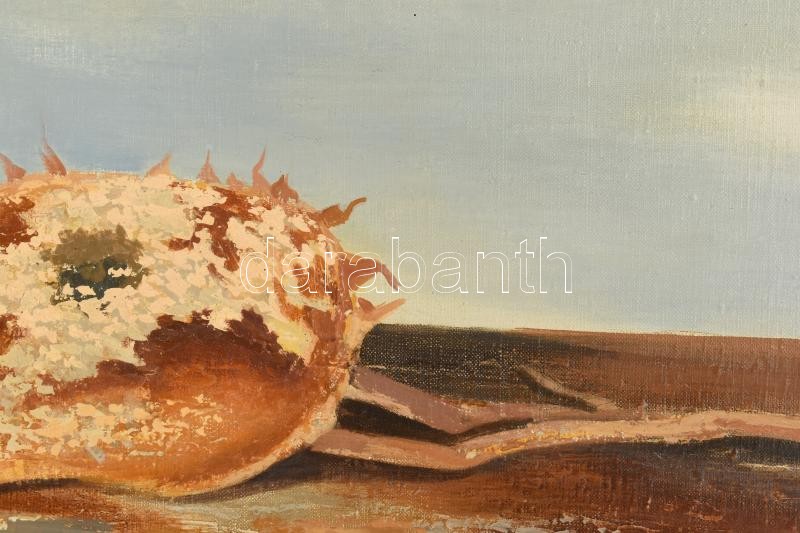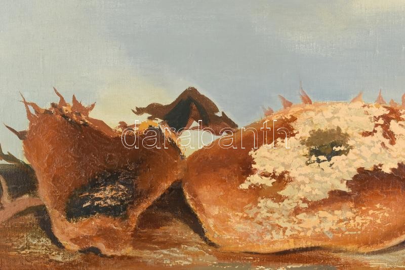 Dezső József (1935-1995): Napraforgók. Olaj, vászon, jelzett, hátoldalán Képcsarnok Vállalat címkéjével. Dekoraítv, kissé sérült fakeretben, 40×80 cm<a href="https://www.darabanth.com/hu/gyorsarveres/417/kategoriak~Festmenyek-es-grafikak/Festmenyek-