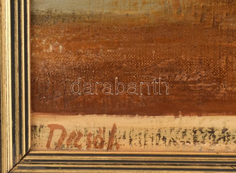 Dezső József (1935-1995): Napraforgók. Olaj, vászon, jelzett, hátoldalán Képcsarnok Vállalat címkéjével. Dekoraítv, kissé sérült fakeretben, 40×80 cm