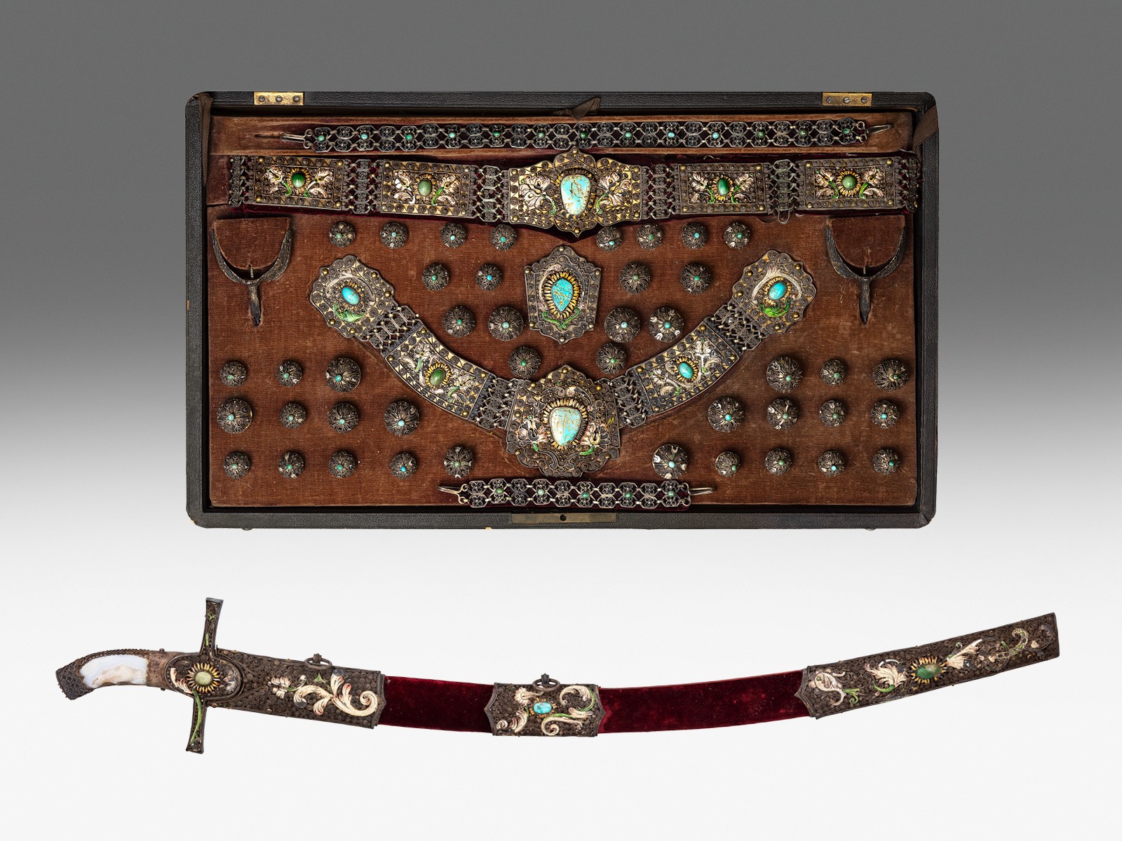 Aranyozott ezüst, bruttó 1475 g. 49 darabos filigránezüst és erdélyi zománcozású garnitúra türkiz kövekkel díszítve, eredeti szarvasbőrrel és selyemmel bélelt dobozában. 1 db díszöv, 1 db mentecsat, 1 db tollforgó, 1 pár sarkantyú (aranyozott sárgaréz), 2