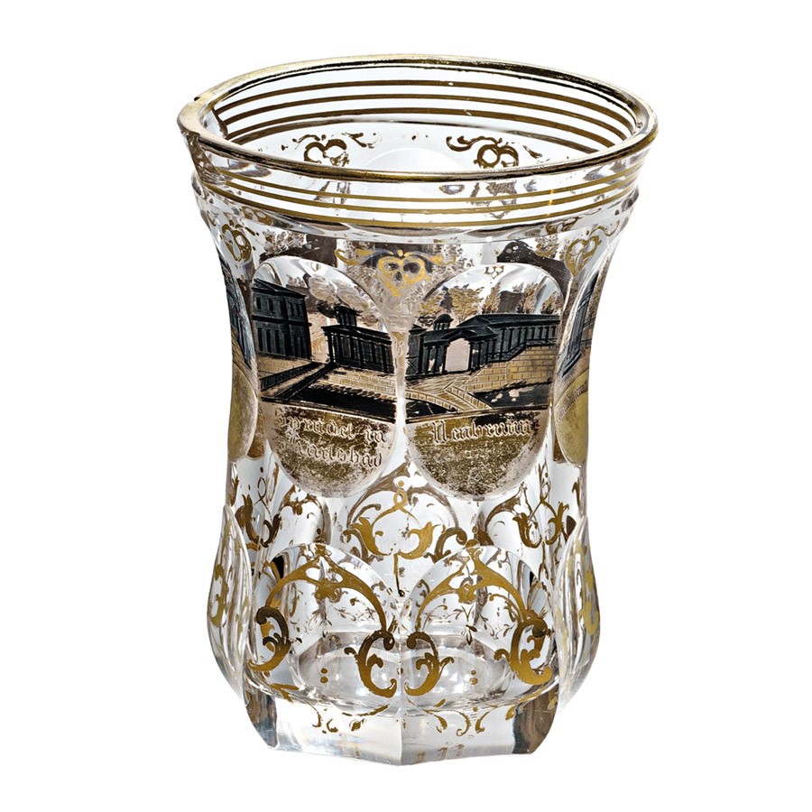 osztrák, 19. sz. második fele, csiszolt színtelen üveg, köszörült, aranyozott díszítéssel, szájperemén csorbulással, aranyozás kopott, m: 11 cm