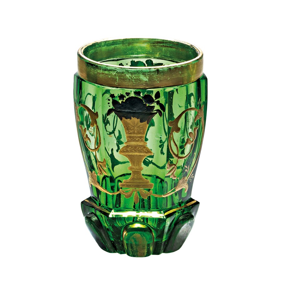 Ausztria, 19. sz. második fele, csiszolt, zöld üveg, aranyozott díszítéssel, aranyozás kopott, m: 11, 2 cm