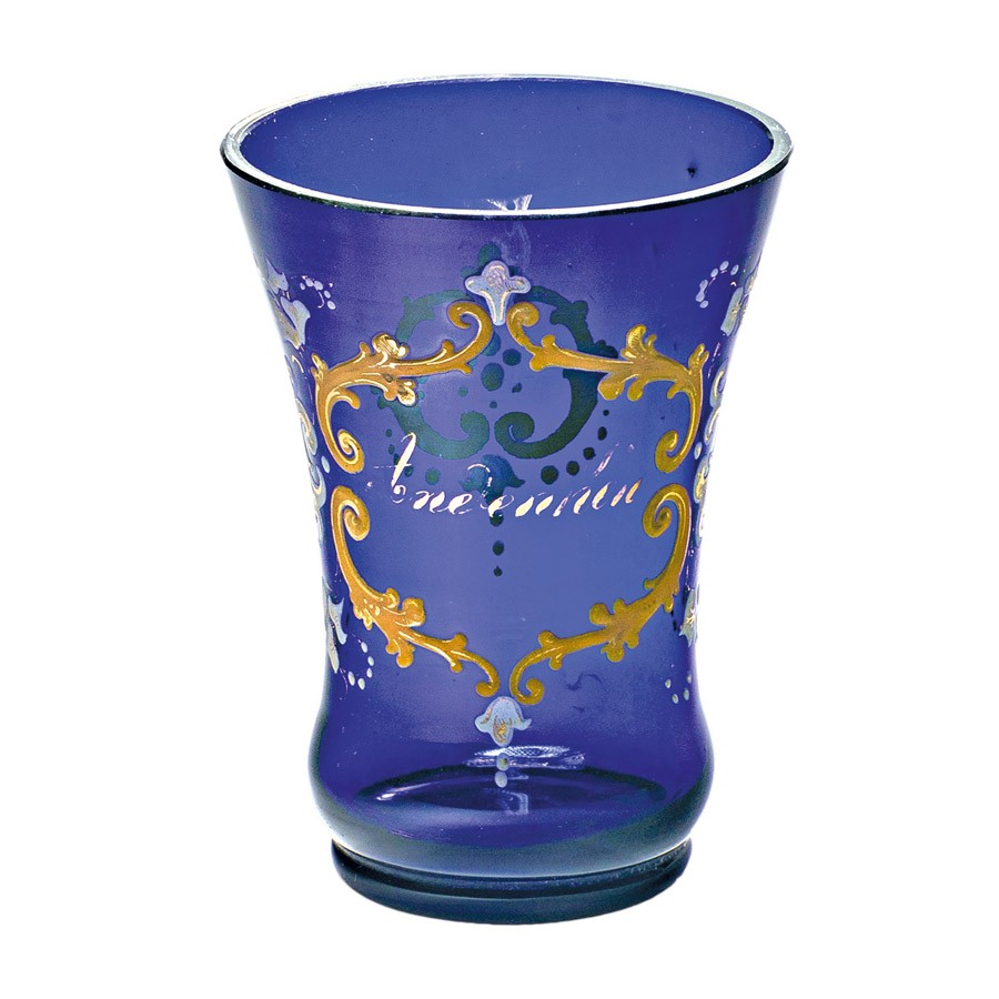 osztrák, 19. sz. második fele, kék színű üveg zománc festett, aranyozott díszítéssel "Andenken" felirattal, aranyozás kissé kopott, m: 12, 3 cm