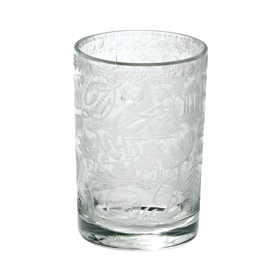 német, 19. sz. második fele, közepe, színtelen üveg, köszörült díszítéssel, D-G-A-G monogramokkal, alján is díszítve, I betűvel szignálva, m: 10 cm