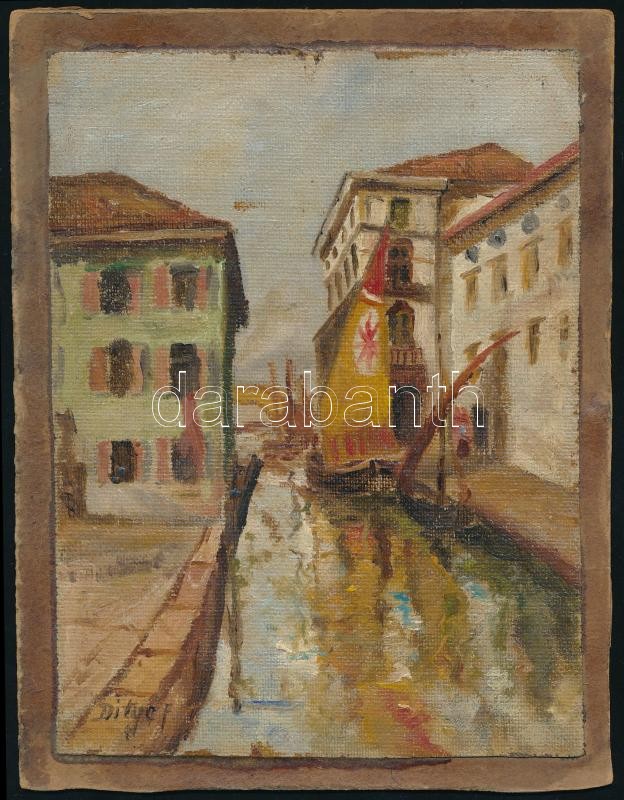 Ditye F jelzéssel: Vízparti város (Velence?). Olaj, vászon, kartonra kasírozva. 16×12 cm