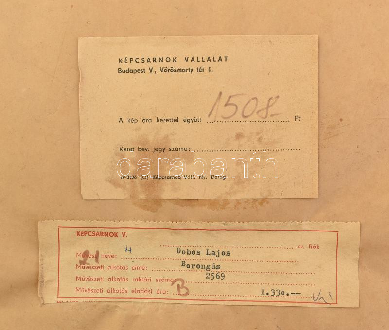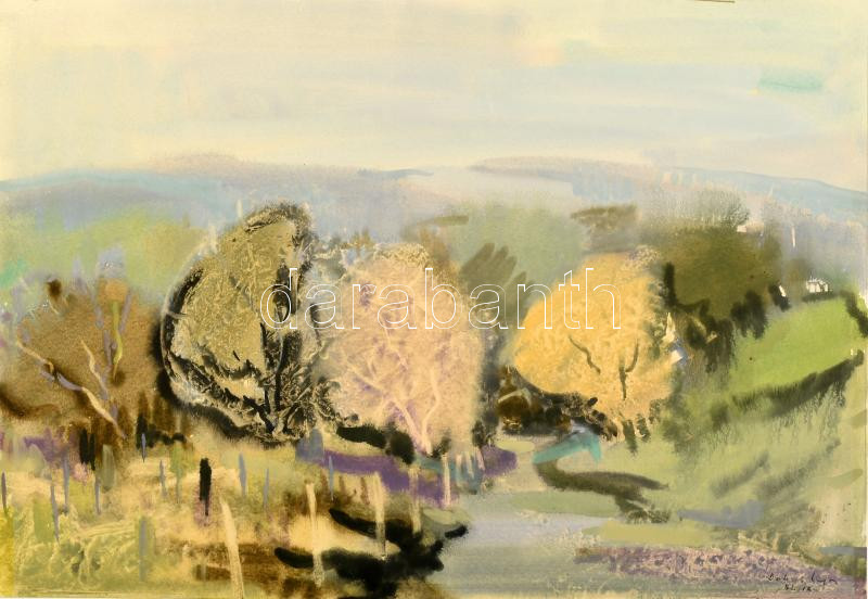Dobos Lajos (1921-2012): Borongás. Akvarell, papír, jelzett. Külön papíron Képcsarnok Vállalat címkéivel. 31,5×45 cm.<a href="https://www.darabanth.com/hu/gyorsarveres/435/kategoriak~Festmenyek-es-grafikak/Festmenyek-es-grafikak~500001/Dobos-Lajos-1