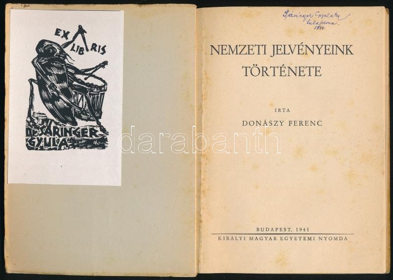 Donászy Ferenc: Nemzeti jelvényeink története. Bp., 1941, Kir. M. Egyetemi Nyomda. Kiadói papír-kötésben, kissé foltos lapokkal, a borító részben elvált a könyvtesttől, névbejegyzéssel és ex libris-szel.<a href="https://www.darabanth.com/hu/gyorsarv