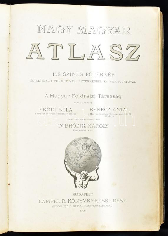 dr. Brózik Károly (szerk.): Nagy magyar atlasz. 158 színes főtérkép és kétszázötvenhét melléktérképpel és névmutatóval. A Magyar Földrajzi Társaság megbízásából, Erődi Béla és Berecz Antal közreműködésével szerk.: – – . Bp., 1906, Lampel R. (Wodianer F. és Fiai), (8) p.+ 158 t.+ 52 p. Kiadói aranyozott, szecessziós félbőr-kötés, Leszik-kötés, Enyhe foxing, gerincen kis