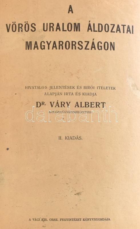 Dr. Váry Albert: A vörös uralom áldozatai Magyarországon. II. kiadás. H.n., é.n., Váci Kir. Orsz. Fegyintézet Könyvnyomdája. 154p. Modern vászonkötésben, egy-két javított oldallal.