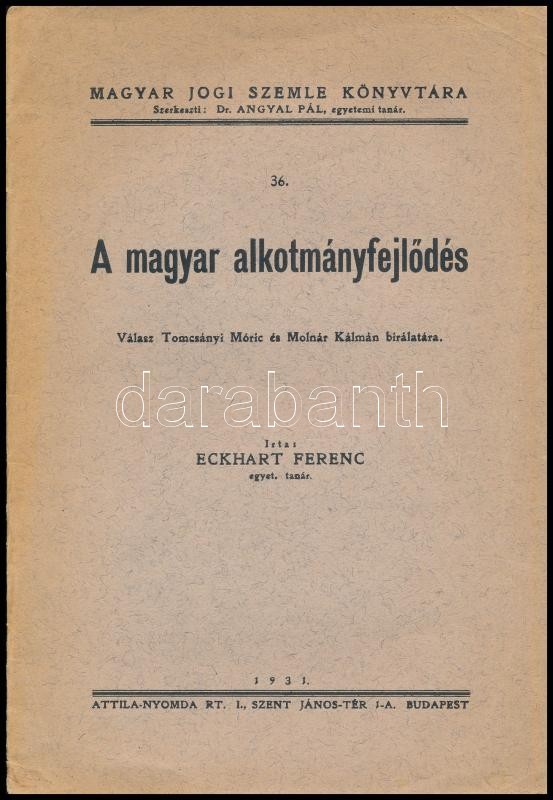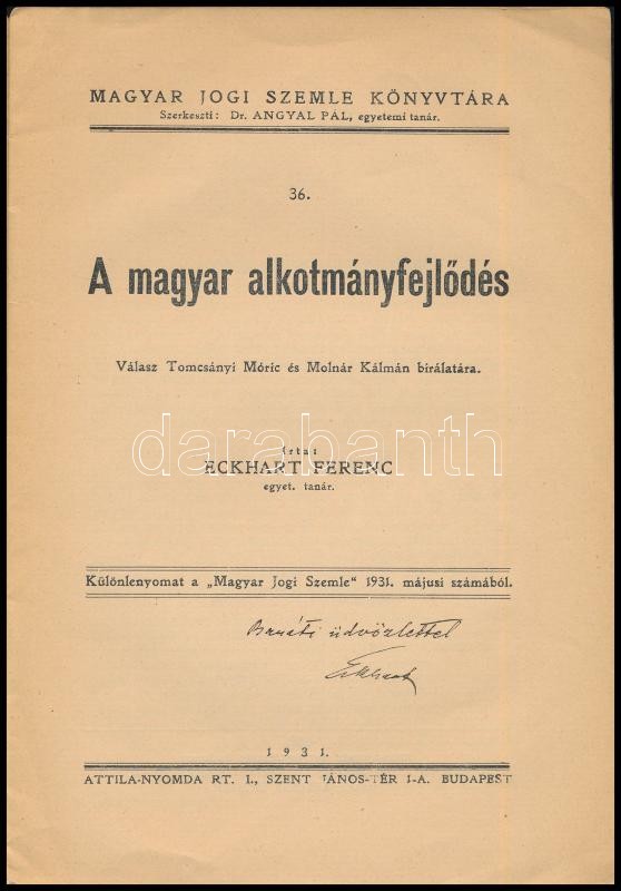 Eckhart Ferenc: A magyar alkotmányfejlődés. A szerző, Eckhart Ferenc (1885-1957) jog- és gazdaságtörténész, levéltáros, egyetemi tanár által DEDIKÁLT példány. Válasz Tomcsányi Móric és Molnár Kálmán bírálatára. Különlenyomat. Magyar Jogi Szemle Könyvtára