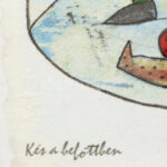 ef.Zámbó (efZámbó) István (1950-): Kés a befőttben. Egyedi beavatkozású print (Ebp), merített papír, jelzett, számozott (IV./VI.). Vincze Mill és ef.Zámbó István szárazbélyegzőivel. Üvegezett fakeretben. 37×26 cm / computer print, mixed technique on paper