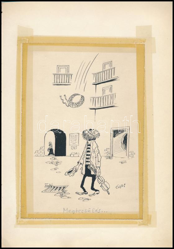 Egri László (1910-1974): Megbecsülés (karikatúra). Tus, ceruza, karton. Jelzett. Ragasztószalaggal papírra rögzítve. 21×14,5 cm<a href="https://www.darabanth.com/hu/gyorsarveres/431/kategoriak~Festmenyek-es-grafikak/Festmenyek-es-grafikak~5000002/Eg