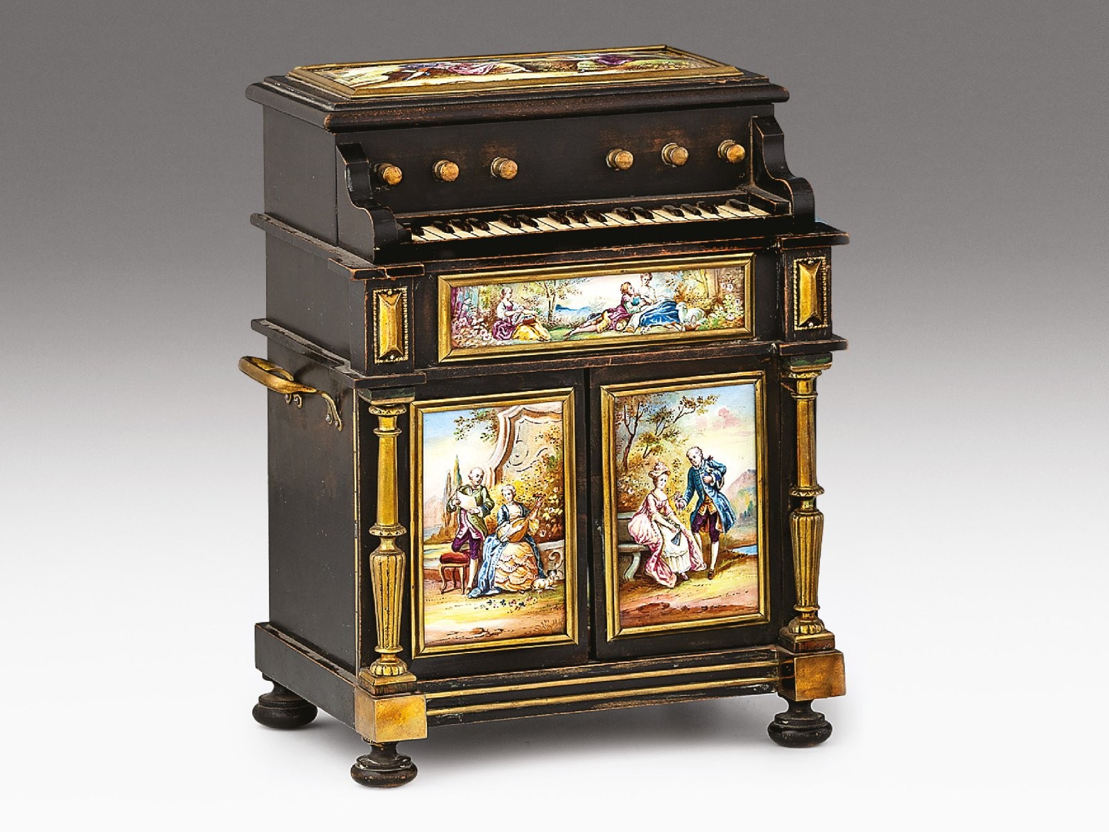 Ékszerdoboz Harmónium formájú, ébenfeketére pácolt, faragott fa tok, titkos nyitódású fiókokkal és zenélő szerkezettel. Oldalain 5 darab aprólékosan megfestett, allegorikus jeleneteket ábrázoló, sárgaréz keretezésű zománc képpel. Német, XIX. század más