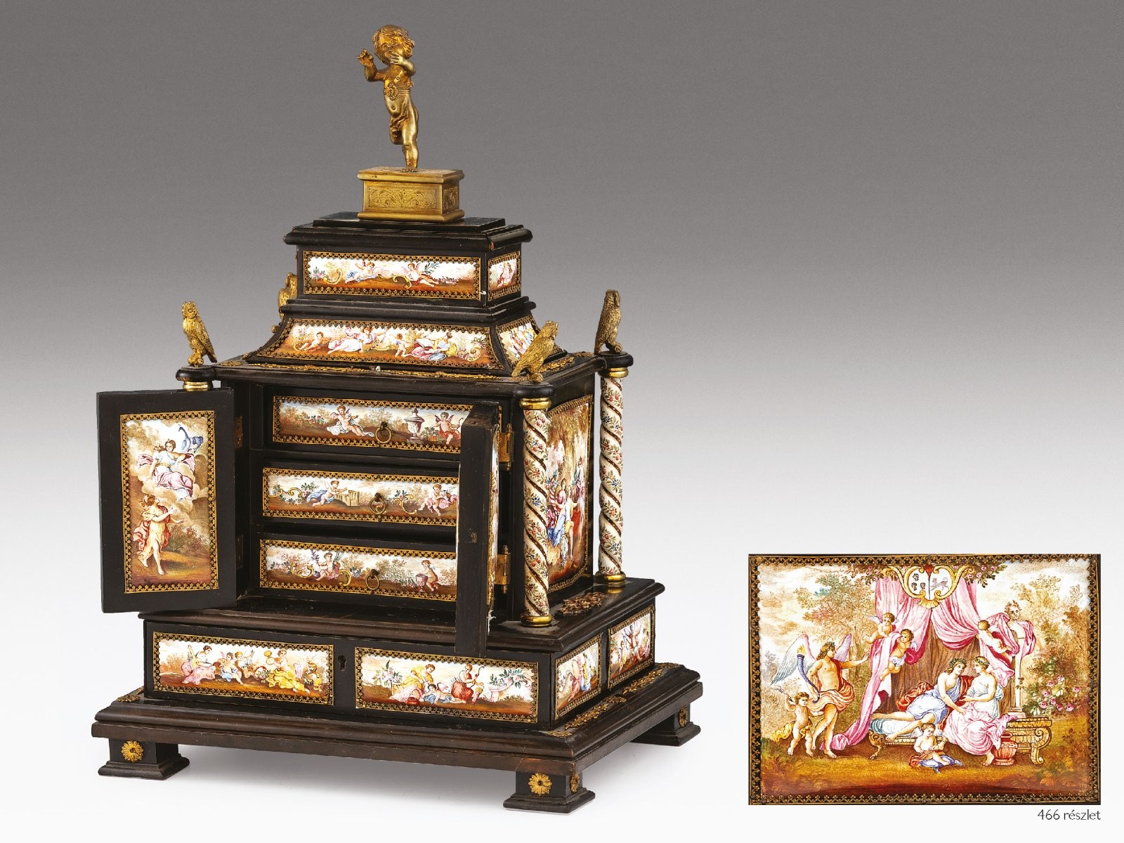 Ékszertartó szekrényke Ébenfeketére pácolt és politúrozott négy fiókos fa szekrényke. Talapzatán és oldalain körben, 26 darab aprólékosan megfestett, allegorikus jeleneteket ábrázoló, sárgaréz keretezésű zománc képpel. Sarkain csavart díszítésű, festet
