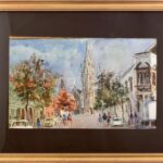 Élesdy István (1912-1987): Mátyás templom. Akvarell, papír, jelzett. Kiállítva: Csontváry Terem, Bp., 1982, egyéni kiállítás. Hátoldalán Képcsarnok Vállalat címkéjével, üvegezett fakeretben. 31×46 cm