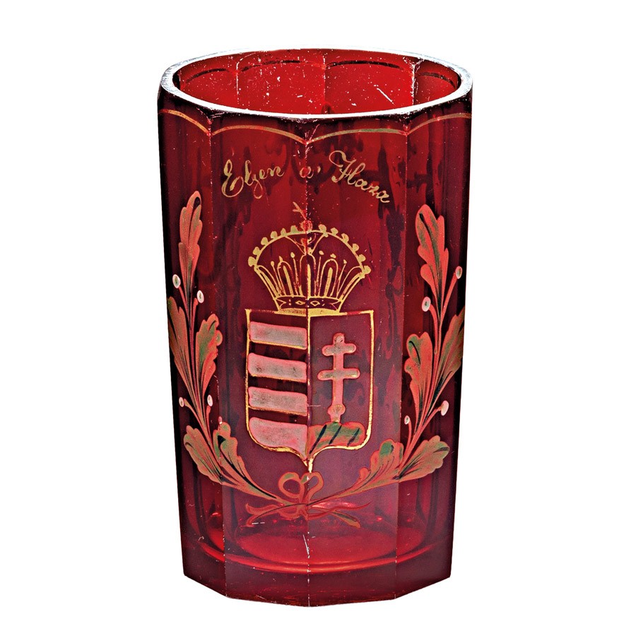 Parád, 19. sz. második fele, csiszolt, bíborpácolt üveg, zománcfestett és aranyozott díszítéssel, kis kopással, m: 14 cm