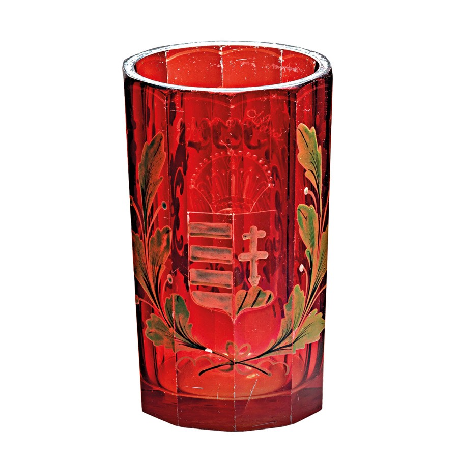 Parád, 19. sz. második fele, csiszolt, bíborpácolt üveg, zománcfestett és aranyozott díszítéssel, aranyozás kopott, m: 14 cm