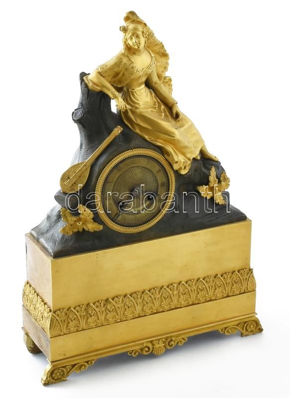 Empire kandallóóra. Franciaország XIX. sz. eleje. Tűziaranyozott bronz, legyezőt tartó női alakkal, külön mandolinnal. Ingajáratos, felesütős szerkezet, szervizelt működő, esztétikailag is hibátlan állapotban. A csengő igazításra szorul m: 38 cm sz: 26,5