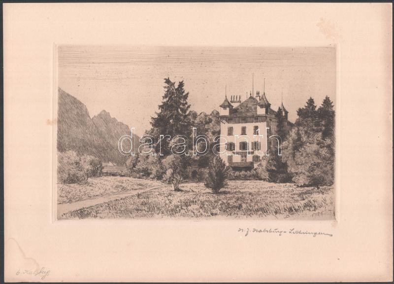 Erzherzog Heinrich Ferdinand von Habsburg-Lothringen (1878-1969): Karlsberg (Salzburg). Rézkarc, papír, jelzett, 15x24cm (Foltokkal)<a href="https://www.darabanth.com/hu/gyorsarveres/419/kategoriak~Festmenyek-es-grafikak/Festmenyek-es-grafikak~50000
