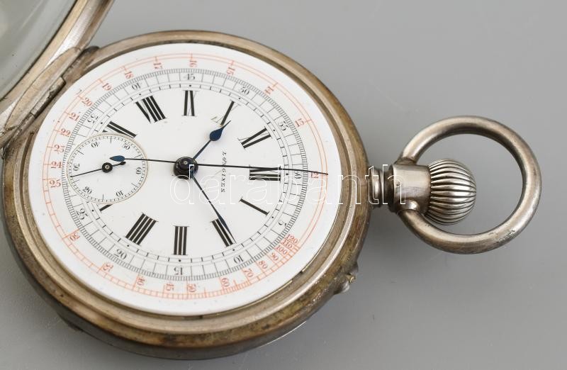 Ezüst (Ag) tokos Longines zsebóra, jelzett számlap, jelzett mechanikus szerkezet, stopper funkció, dupla ezüst (Ag) jelzett tok Működő, szép állapotban. Svájc 1871. d:50mm (a második tokon véset: Králik Sándor Budapest.) Králik Sámuel (Besztercebánya, 181