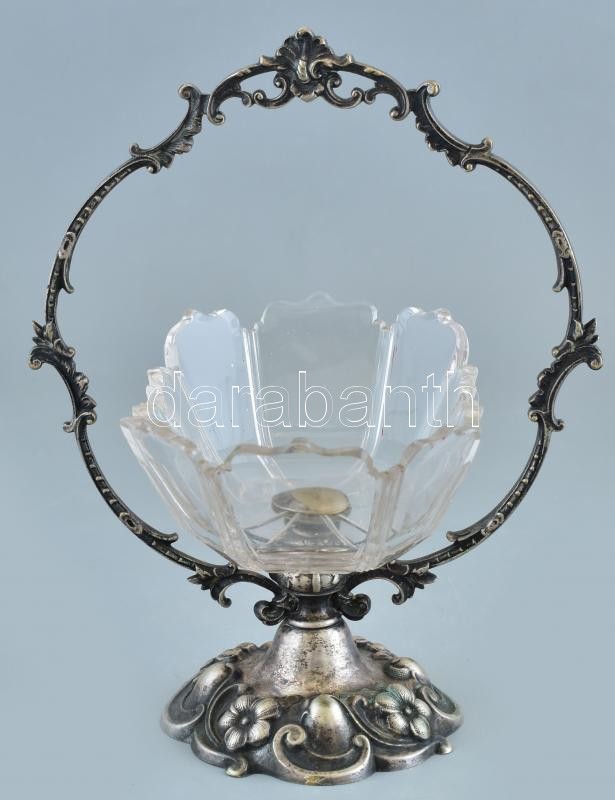 Ezüstözött fém kínáló, üveg betéttel, kopásnyomokkal, m:26cm<a href="https://www.darabanth.com/hu/gyorsarveres/414/kategoriak~Mutargy-papirregiseg-egyeb/Bolhapiac~500012/Ezustozott-fem-kinalo-uveg-betettel–kopasnyomokkal-m26cm~II2580067/?utm_source