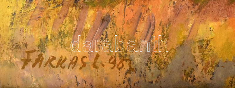 Farkas Lajos (1919-1998): Domboldal. Olaj, farost. Jelzett. Hátoldalán autográf felirattal és Képcsarnok Vállalat címkéjével, mely szerint szerepelt az 1983-ban a szombathelyi Derkovits-teremben rendezett kiállításon. Üvegezett fakeretben. 50×80 cm<