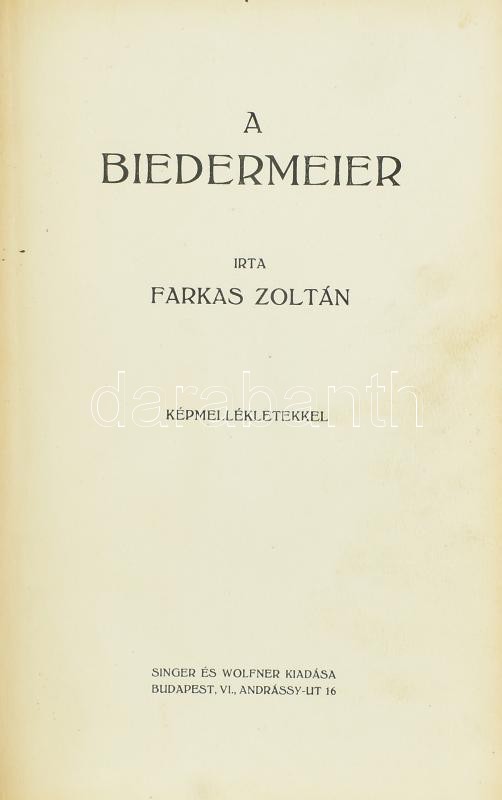 Farkas Zoltán: A biedermeier. Képmellékletekkel. Bp.,én., Singer és Wolfner. Fekete-fehér képtáblákkal illusztrált. Átkötött kissé kopott félvászon kötés.